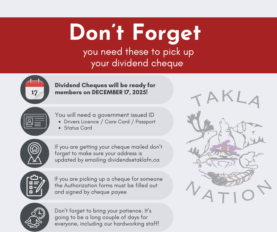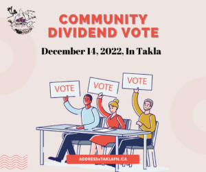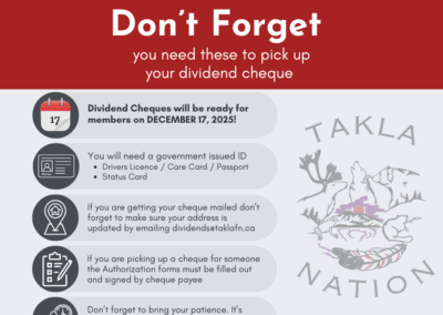 mailing address to: dividends@taklafn.ca along with a copy or a photo of your ID.