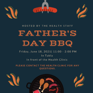 « All Events This event has passed. Father’s Day BBQ June 18, 2021 @ 11:00 am - 2:00 pm « Wiping of the Tears Healing Ceremony Virtual Father’s Day Contest » Related Add to calendar Google Calendar iCalendar Outlook 365 Outlook Live Details Date: June 18, 2021 Time: 11:00 am - 2:00 pm Venue Health Clinic