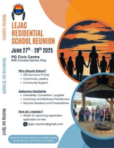 The Lejac Residential School Reunion is a two-day gathering that will bring together survivors of the Lejac Indian Residential School, their families, Elders, Knowledge Keepers, and community members to honour the past, acknowledge lived experiences, and continue on the path of healing.